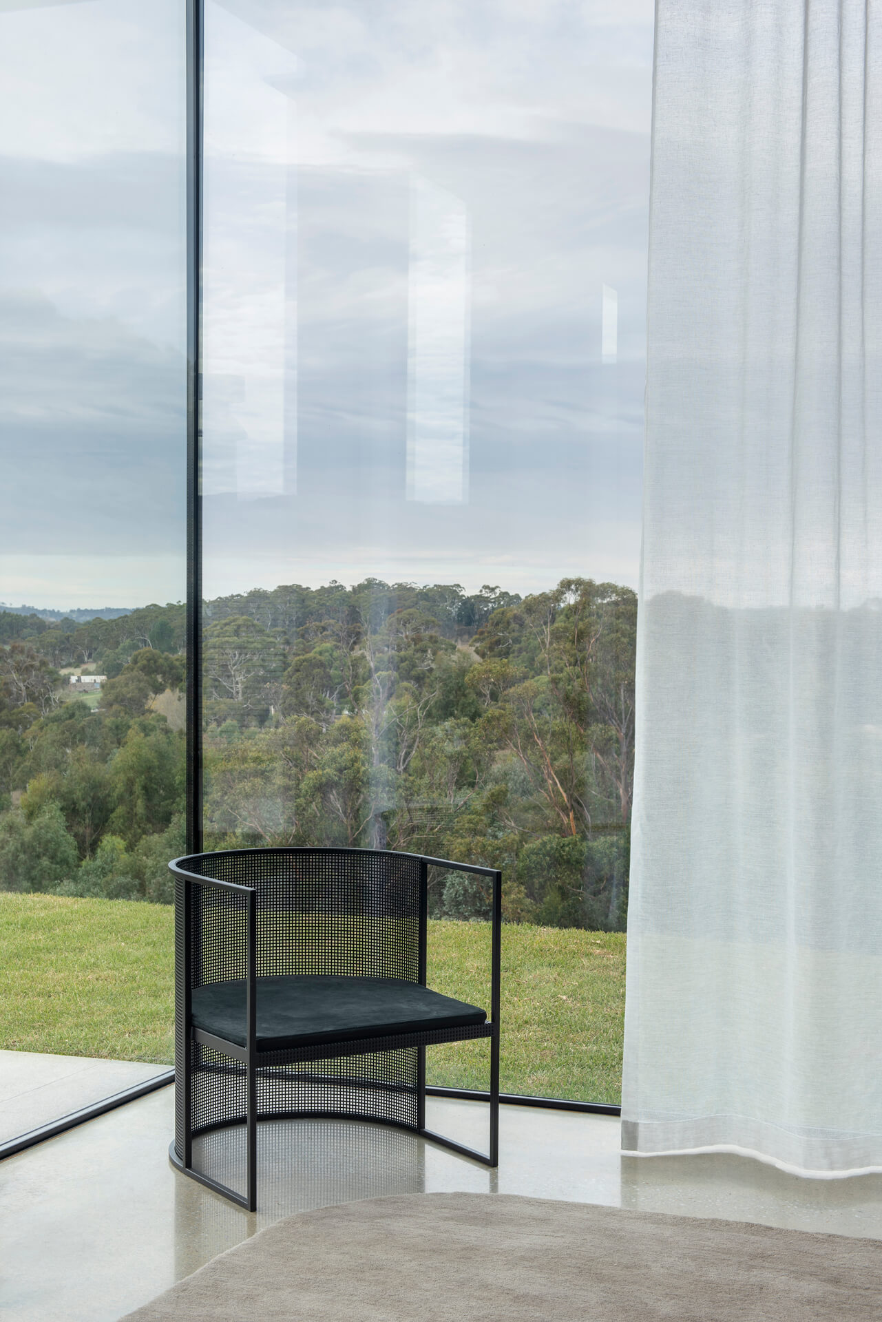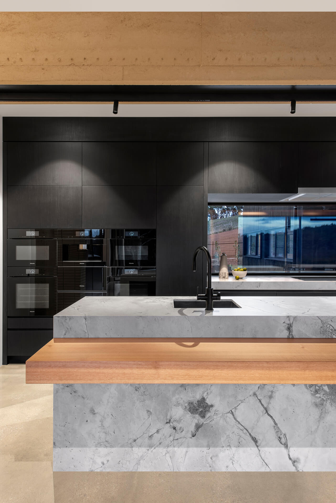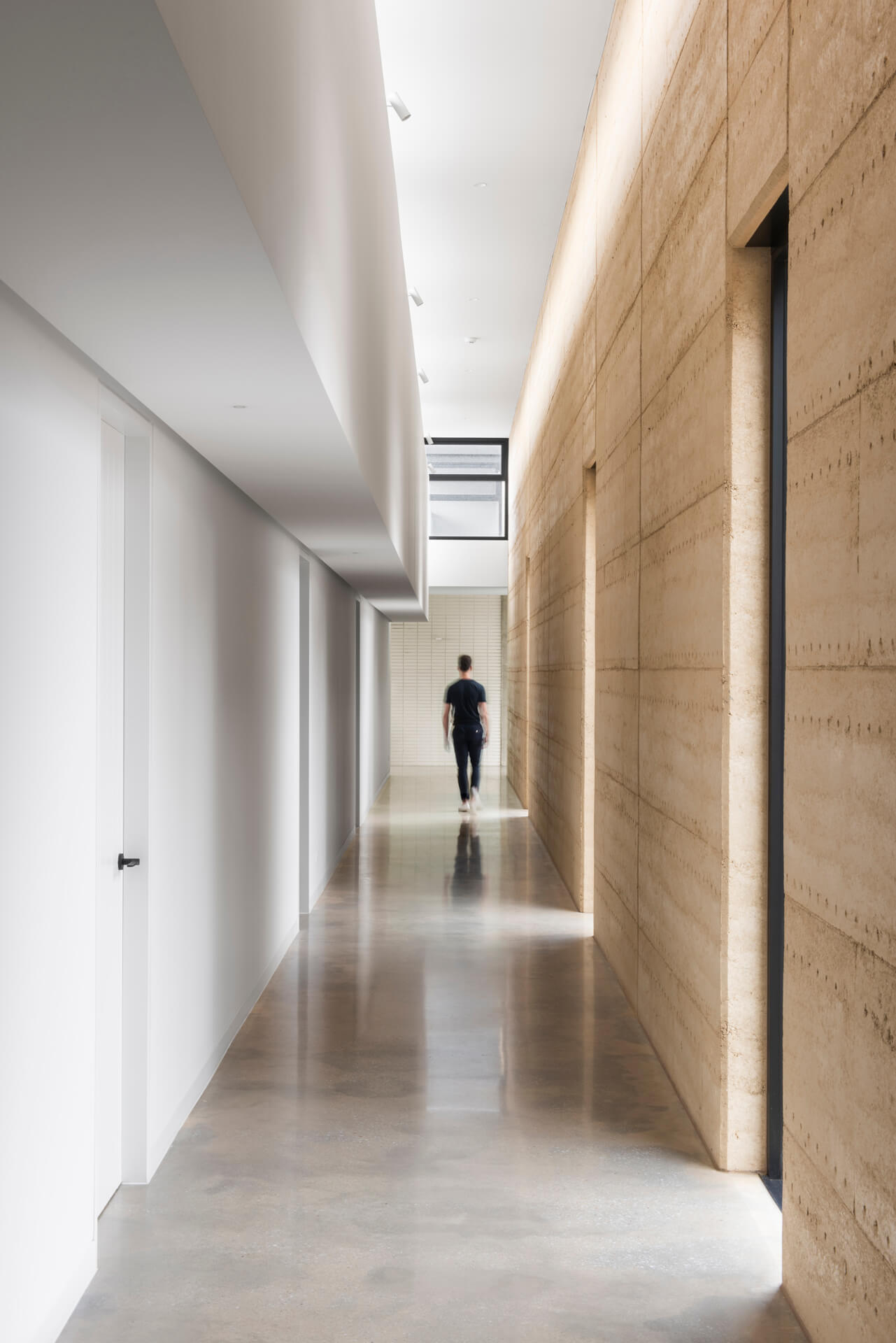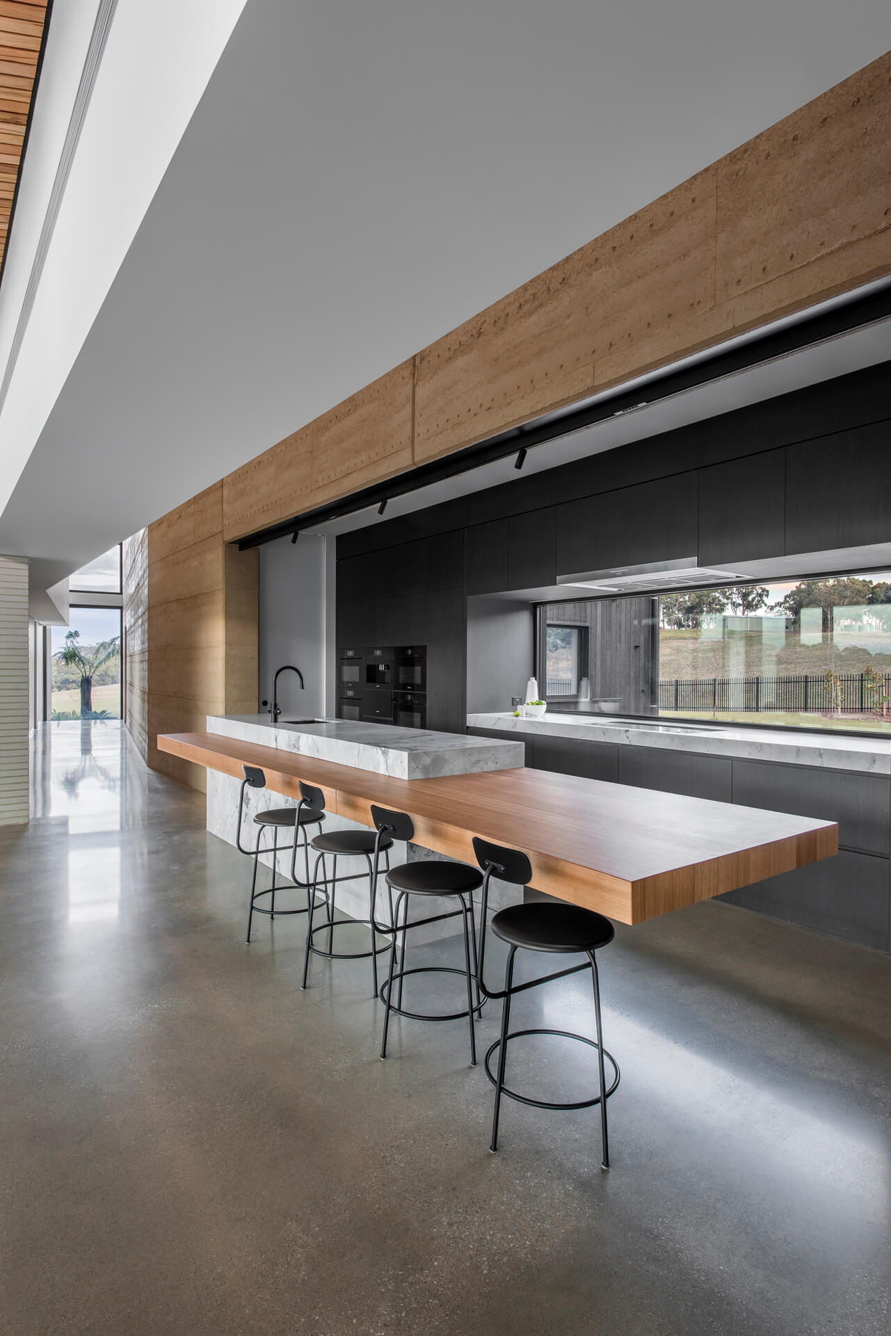Key construction elements included a 65-metre-long cantilevered rammed earth wall, imported low-profile glazing systems sourced directly from a European fabricator, a fully integrated 12-seat cinema, and a temperature-controlled wine cellar housing over 3,000 bottles. Architecture and interior design by Atelier Bond.